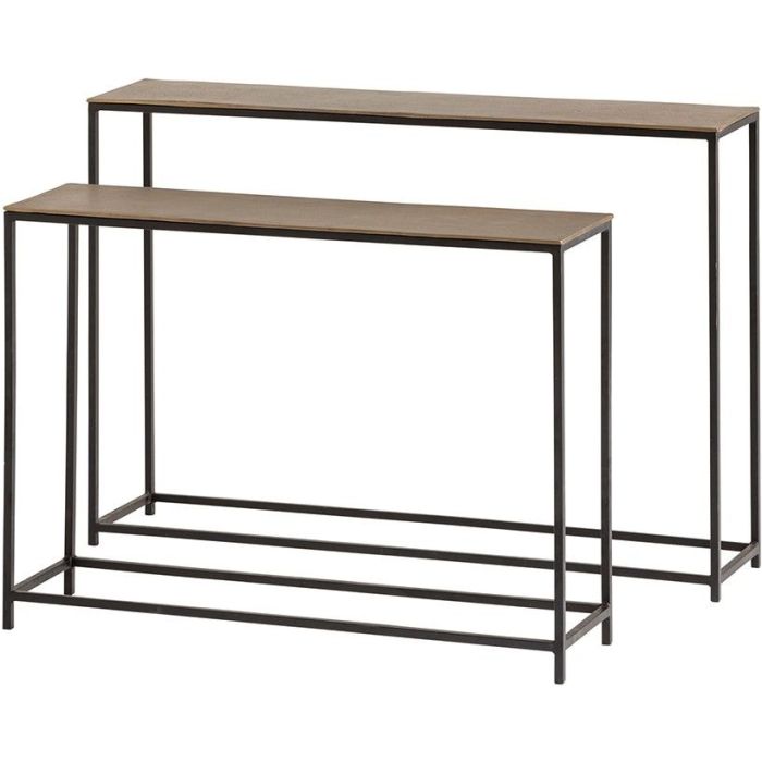 Deze set bestaat uit twee wandtafels (of sidetables) met verschillende afmetingen: de grotere tafel heeft een lengte van 117 cm, terwijl de kleinere een lengte van 100 cm heeft. Beide tafels zijn ideaal voor het plaatsen van decoraties, lampen of andere accessoires in de woonkamer, hal of slaapkamer. Ze voegen zowel functionaliteit als stijl toe aan je interieur.